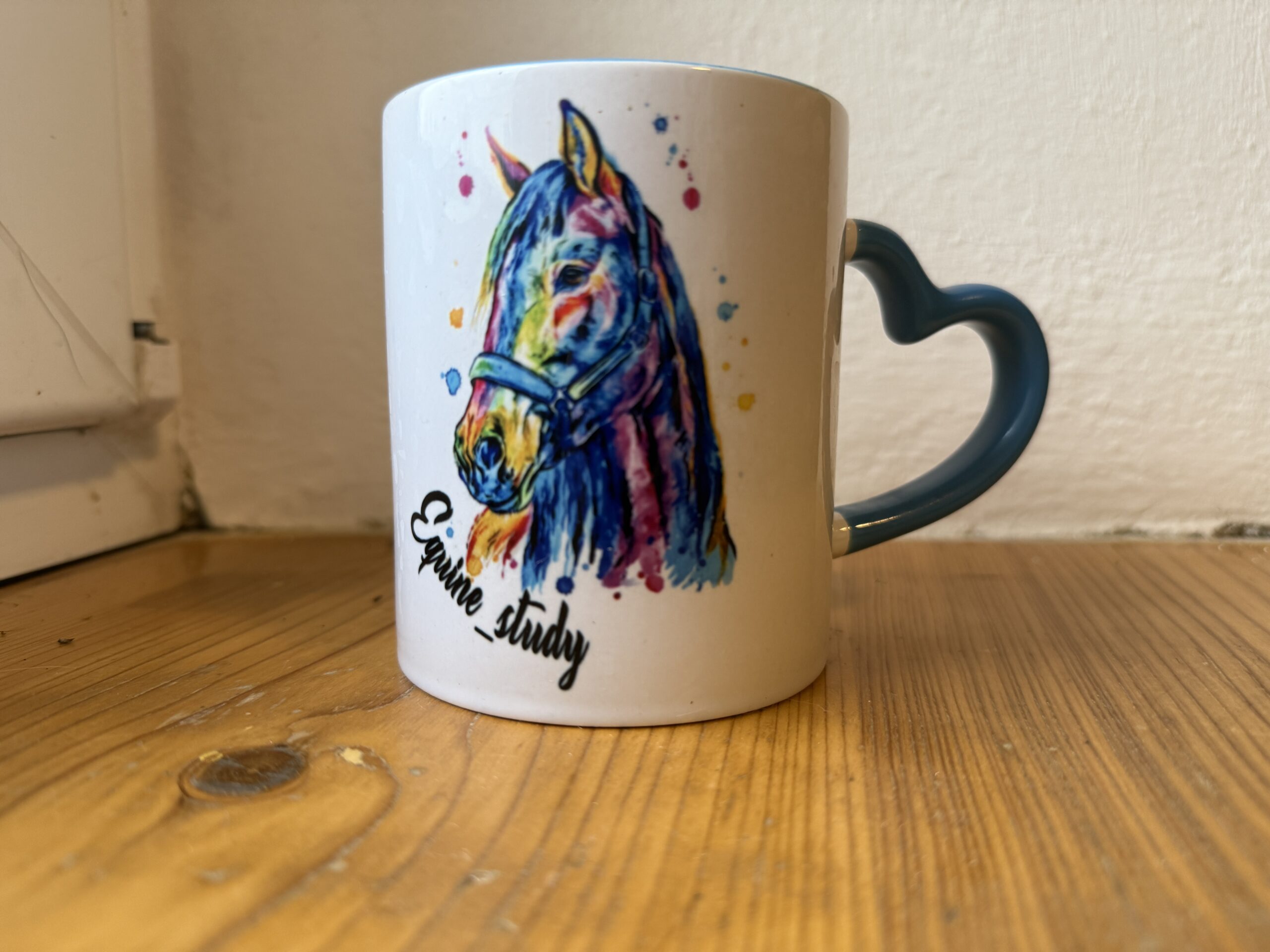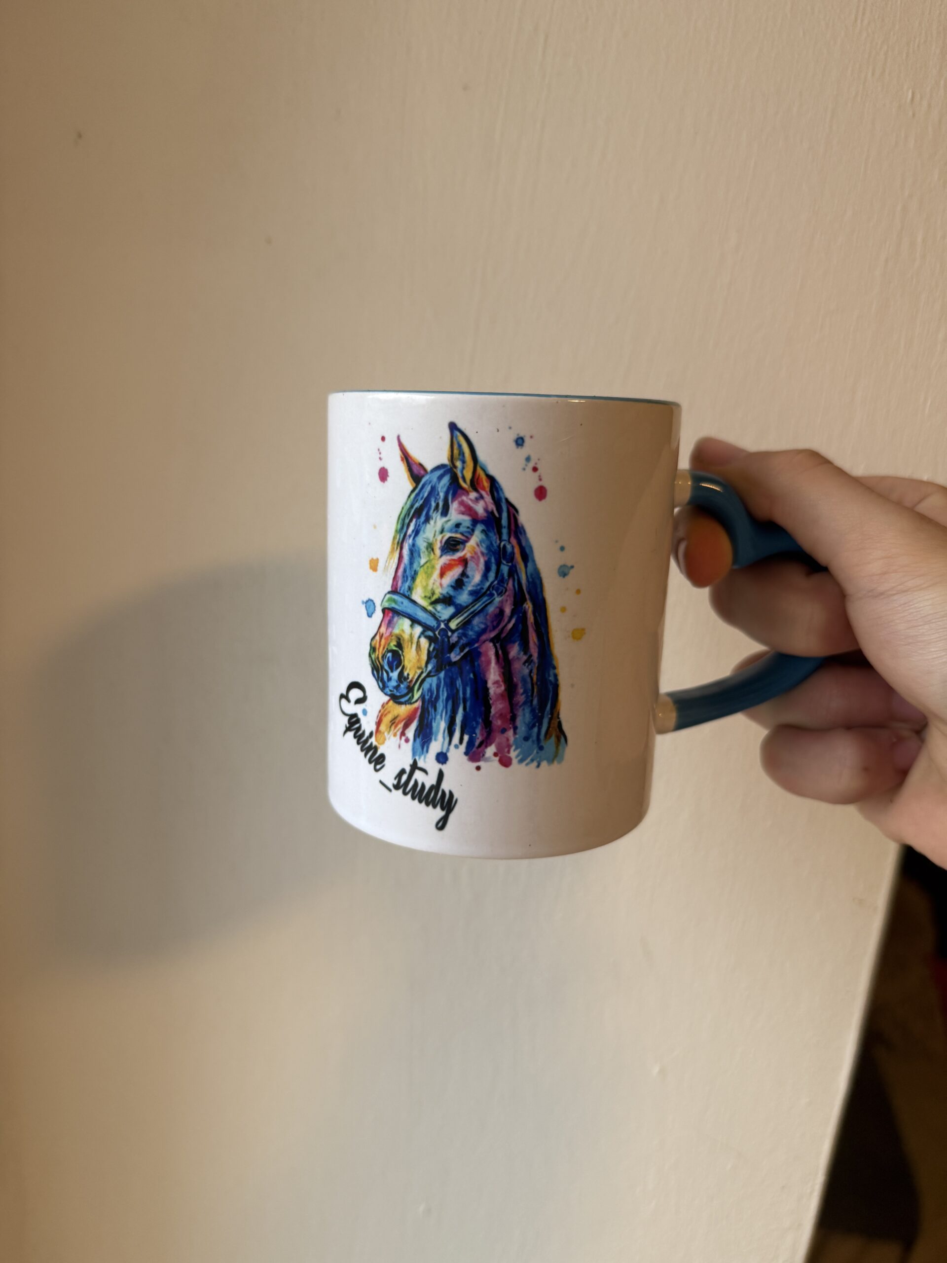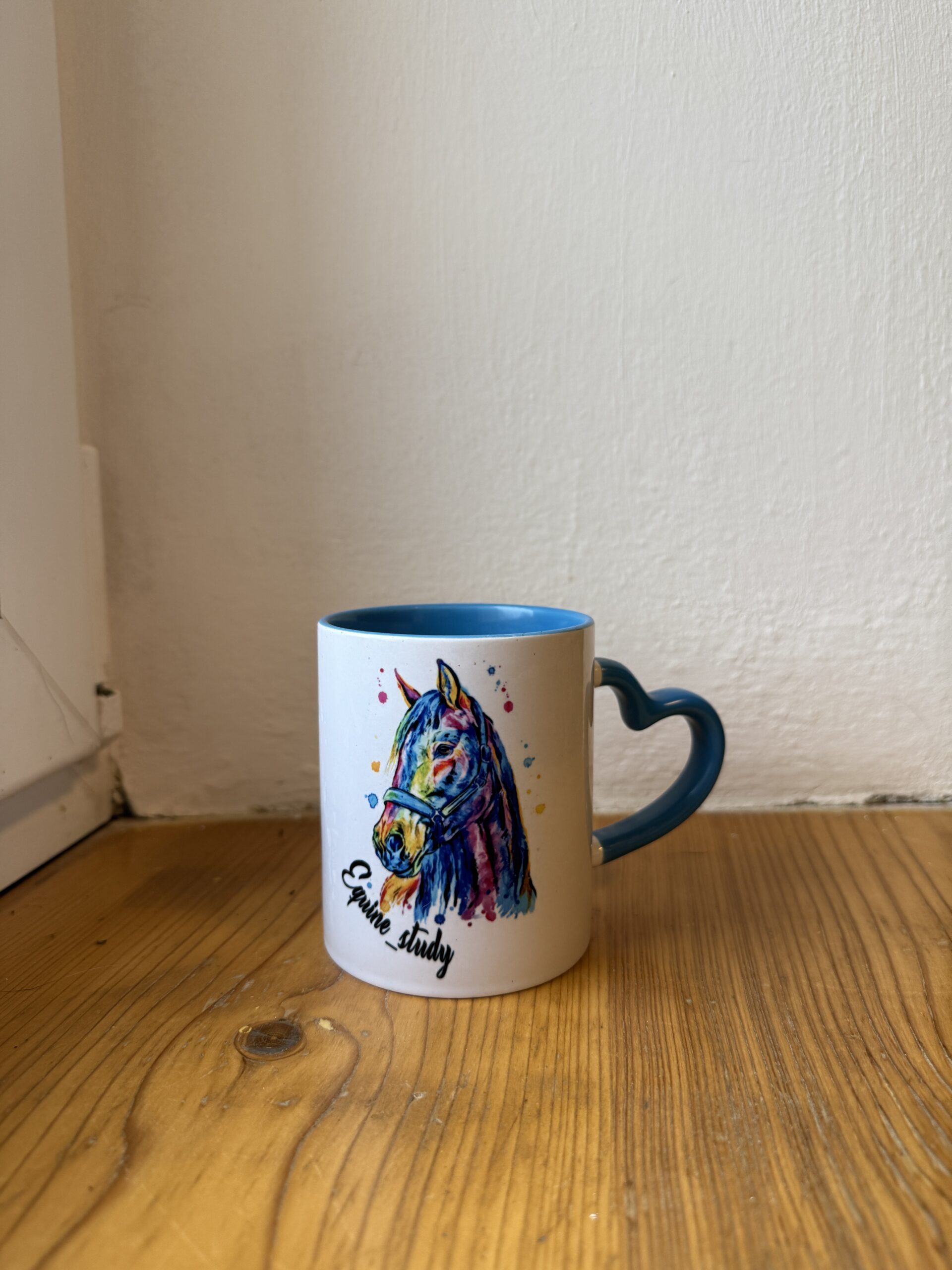 Stylový keramický hrnek s modrým vnitřkem a ouškem a výrazným motivem koně pro všechny milovníky koní a barevného designu.